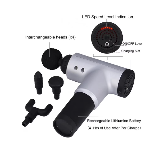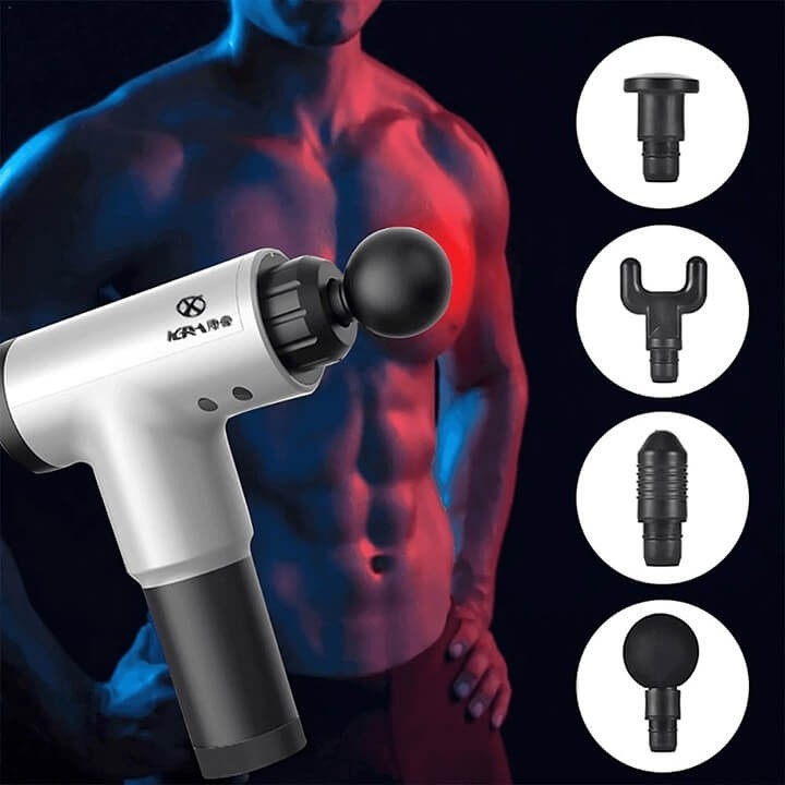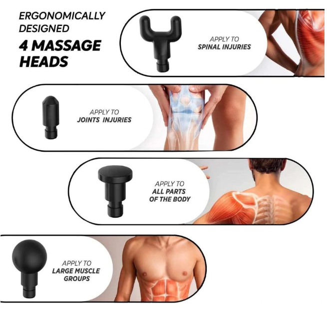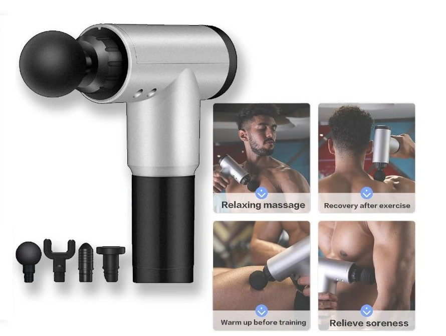Aparatul de masaj cu 4 capete asemănător cu un pistol a fost conceput atât pentru uz profesional, cât și pentru uz casnic. Foarte bun pentru ameliorarea durerilor musculare și articulare.
