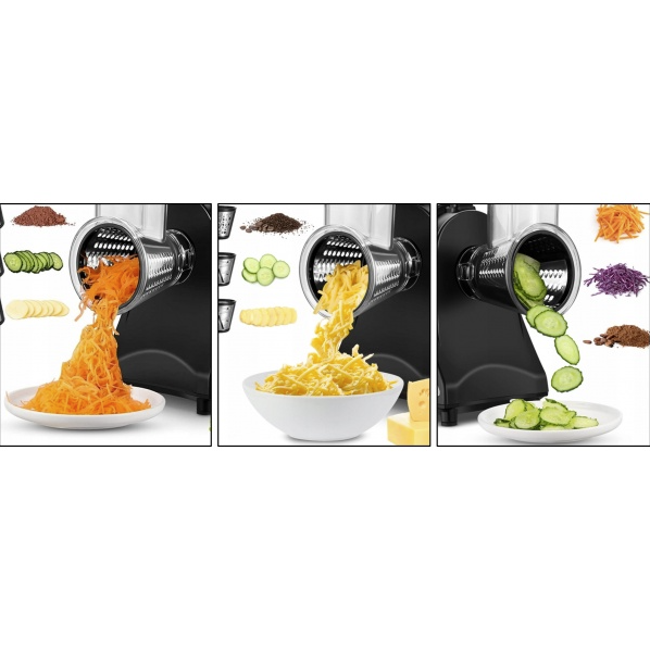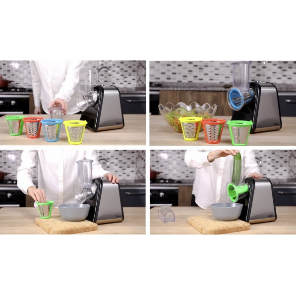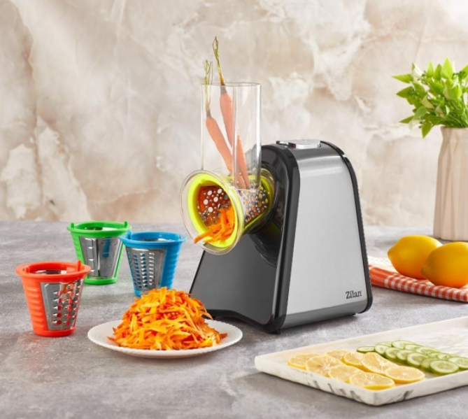 Aparatul de facut salata ZILAN SaladMaker imbina puterea unui motor de 200 W cu 4 accesorii pentru taiere legumelor sau fructelor: accesoriu pentru feliat, accesoriu pentru cartofi, acesoriu fin, accesoriu pentru legume tari.