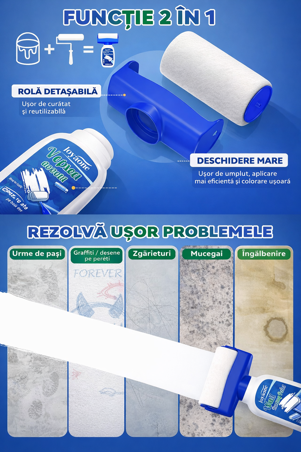 • Rolă integrată pentru aplicare rapidă – permite distribuirea uniformă a vopselei direct pe perete.